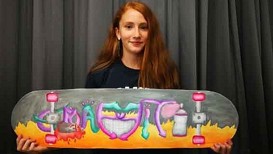 Laura Stadler aus der 8a präsentiert das Kunstwerk des Monats September. Die Schülerinnen und Schüler beschäftigten sich im letzten Schulhalbjahr mit Skateboard-Design, wobei sie ein Skateboard in Originalgröße gestalteten.