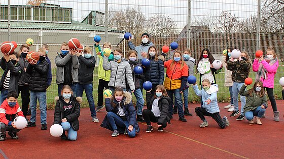 Stellvertretend für das HHG nahm die Klasse 5d mit Sportlehrer und Initiator der Aktion Horst Liß die Materialien für den Sportunterricht mit Vorfreude auf eine baldige Benutzung in Empfang.