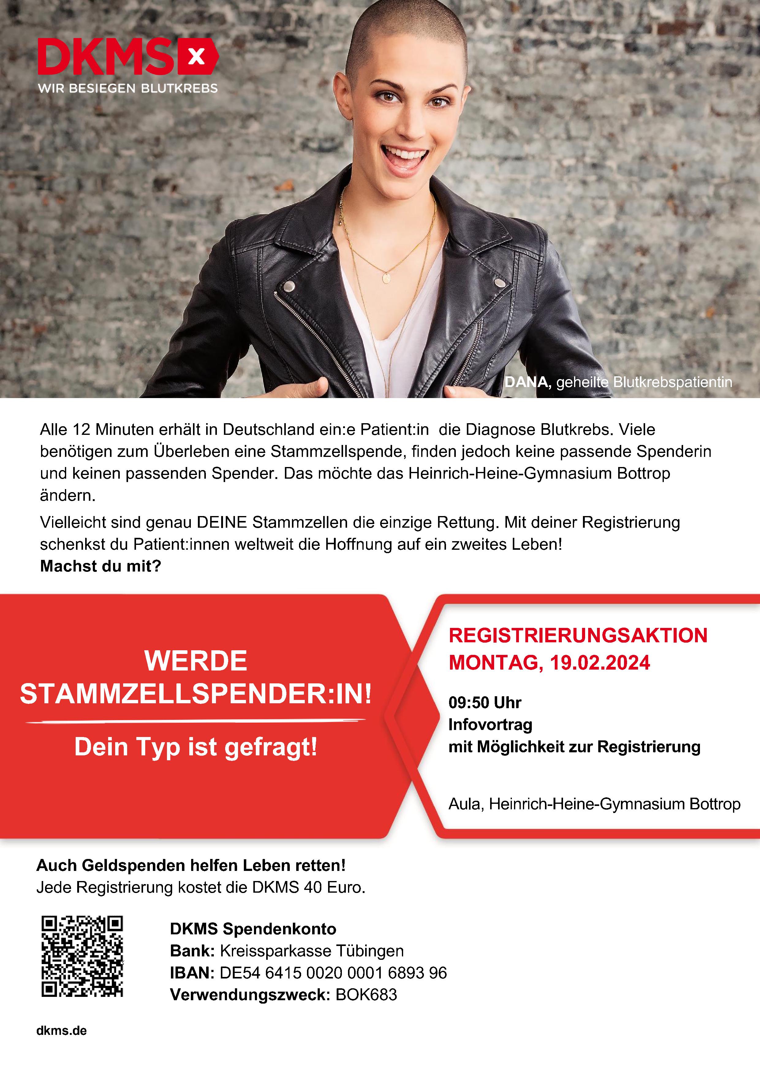 am Montag, 19.02.2024, findet in der 3./4. Stunde eine DKMS-Typisierungsaktion der SV bei uns am HHG statt. Die Veranstaltung beginnt mit einem etwa 60-minütigen Infovortrag in der Aula, im Anschluss daran besteht für alle Schüler/ -innen ab 17 Jahren die Möglichkeit, sich bei der DKMS registrieren zu lassen.