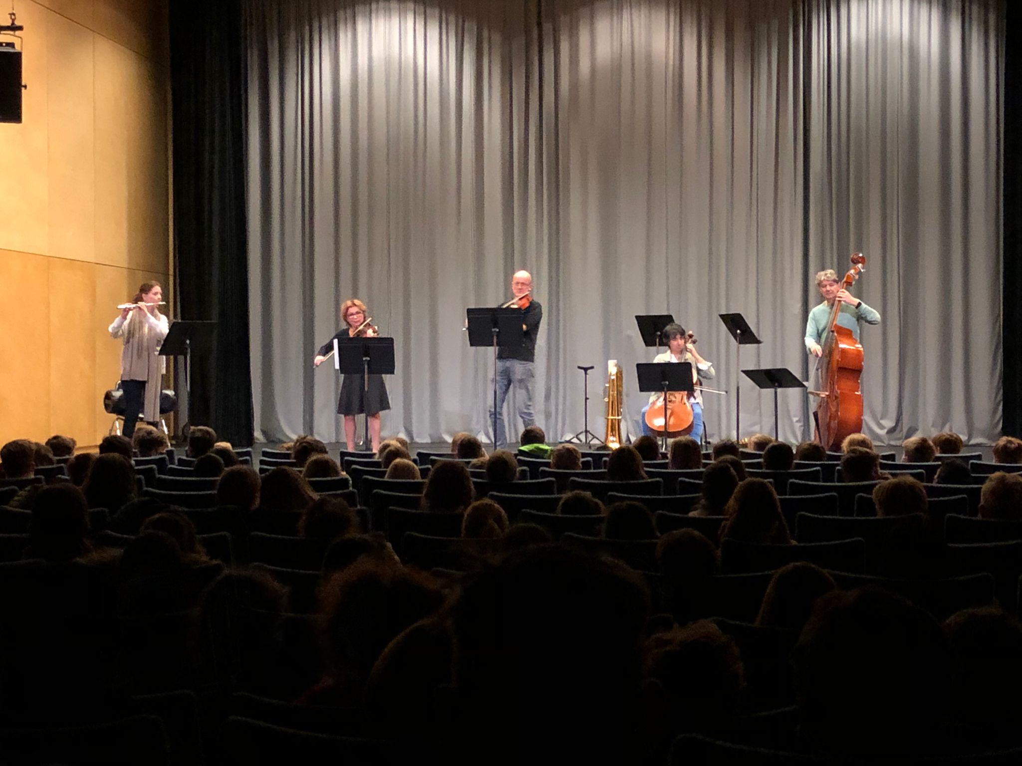 Einen bunten Konzertvormittag voll verschiedener Klänge erlebte die Jahrgangsstufe 5 am Freitag im Kammerkonzertsaal. Die langjährige Kooperation mit der Musikschule ermöglichte es, die aktuelle Unterrichtsreihe „Dem Klang auf der Spur“ mit einem Konzert der Instrumentalpädagogen der Musikschule Bottrop zu komplementieren.