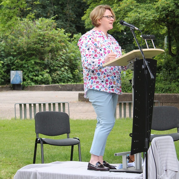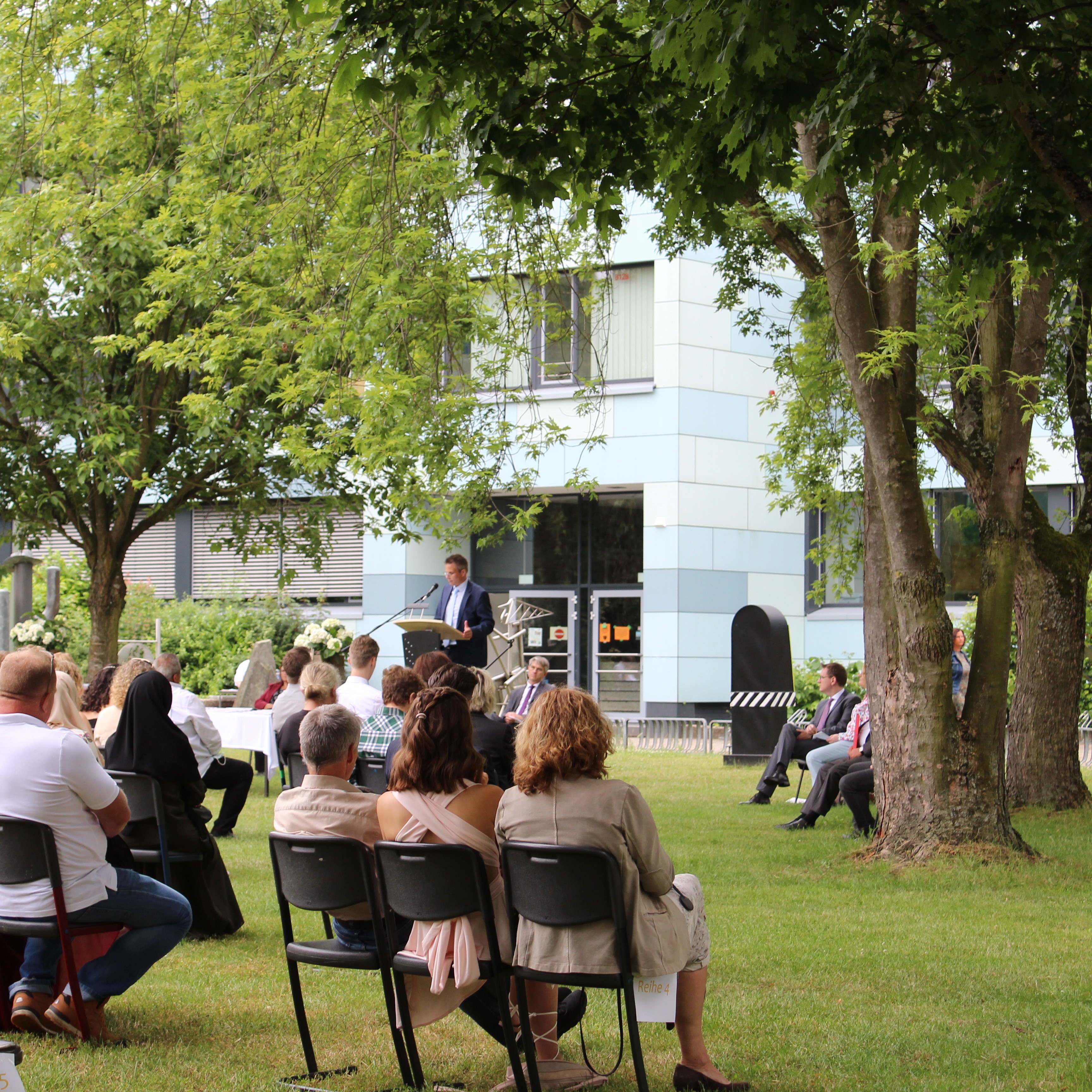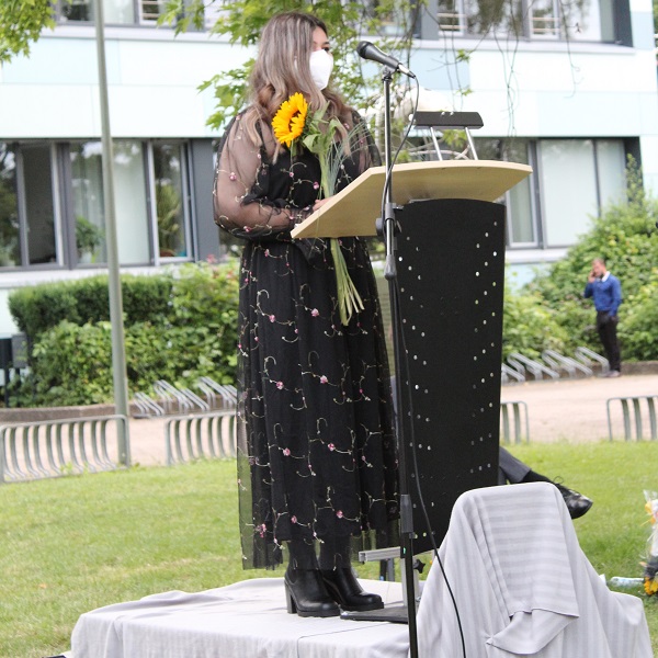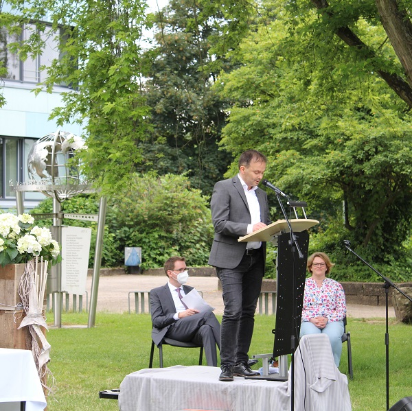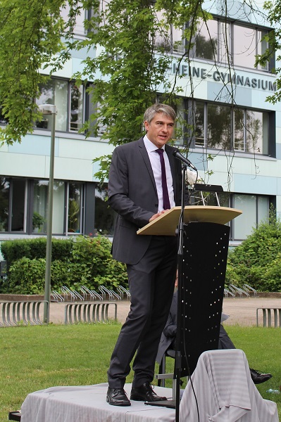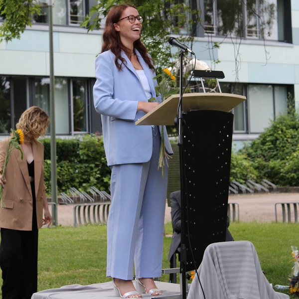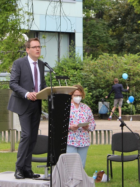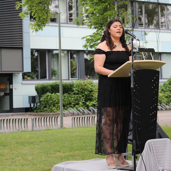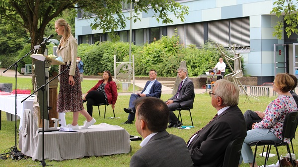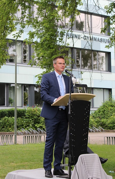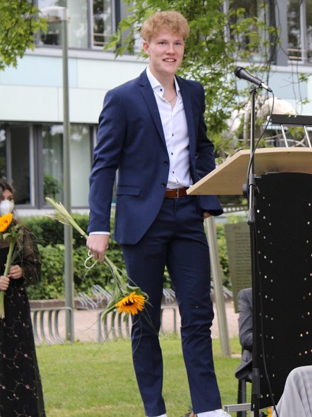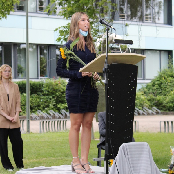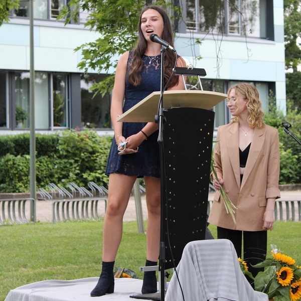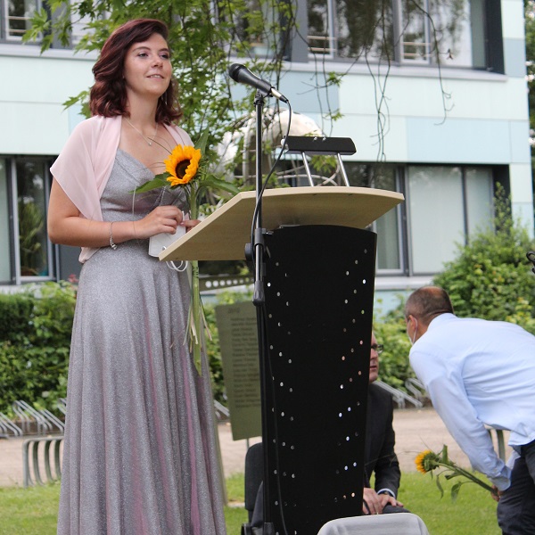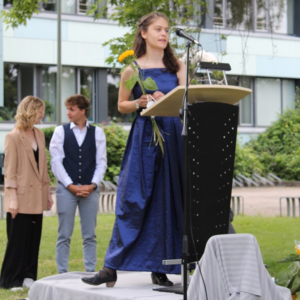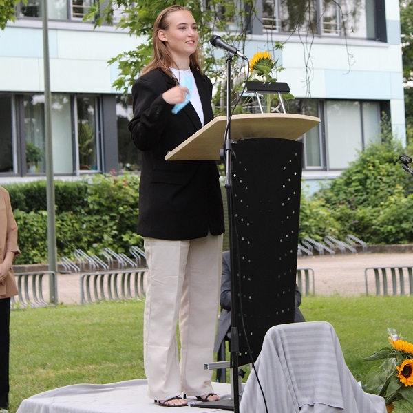 In ihren Reden gedachten die Jahrgansstufenleiter Sonja Klingsporn und Christian Lindemann der zurückliegenden Jahre der Qualifikationsphase, besonderer Momente und Herausforderungen. Auch die Schülervertreter Tessa Berghoff und Lukas Fleger schlossen sich in ihren Reden diesem Rückblick an, zeigten aber auch große Vorfreude auf den nun folgenden Lebensabschnitt und enthüllten das von ihrem Jahrgang gestiftete Denkmal.