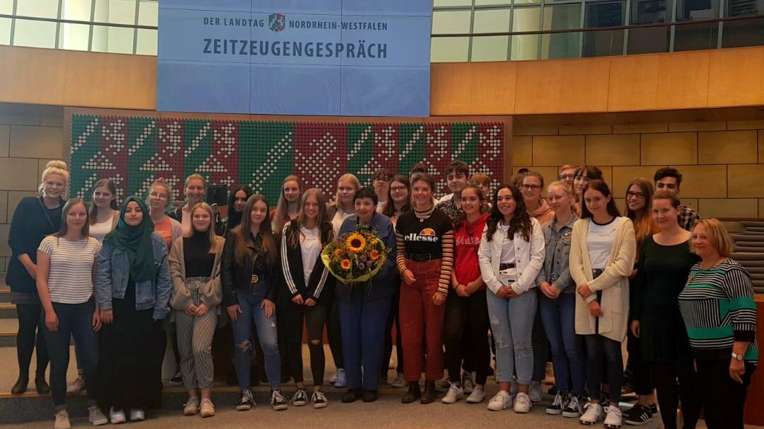 Sie sollten sich für das Gute entscheiden, nicht den falschen Menschen hinterher laufen – dieser eindringliche Appell der Holocaust-Überlebenden Inge Auerbacher ist den Schülerinnen und Schülern des Heinrich-Heine-Gymnasiums (HHG) im Gedächtnis geblieben. 28 von ihnen hatten die Möglichkeit, im Landtag an einem Zeitzeugengespräch mit Inge Auerbacher teilzunehmen. Die berichtete dort von ihren Erfahrungen als jüdisches Kind in der NS-Zeit und ihrem Überleben im Konzentrationslager Theresienstadt. Julia Keller, die als Lehrerin mit in Düsseldorf war, spricht im Nachhinein von einer „bewegenden Begegnung“.