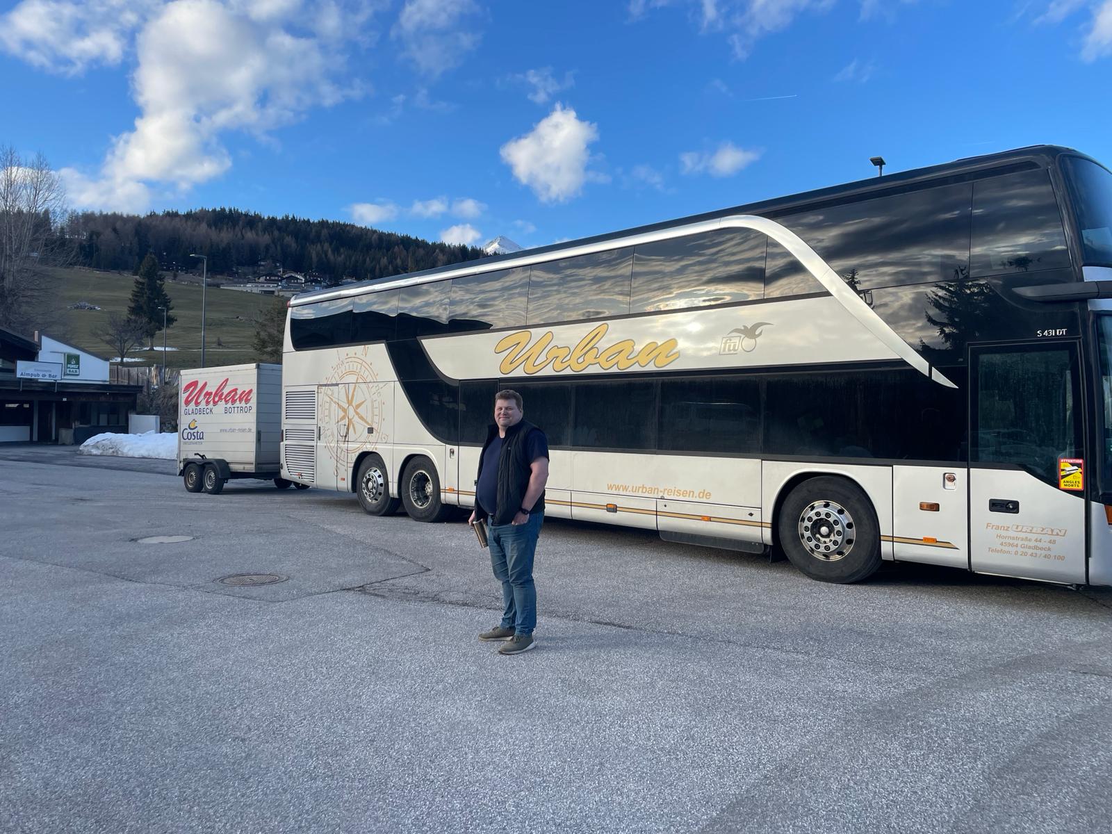 In diesem Jahr gab es am 29.02.24 eine kleine Panne. Beim Rückwärtsrangieren wurde zu früh eingelenkt, der Bus fuhr sich an dem kleinen Hügel neben der Talstation fest und drohte zu kippen. Der Held des Tages war der Busfahrer Martin Kafka. Er löste seinen unglücklichen Kollegen ab, beruhigte unsere Schülerinnen und Schüler, brachte den Bus gemeinsam mit den Helfern der meransener Feuerwehr wieder auf Kurs und fuhr den Bus schließlich sicher über die Grenze.
