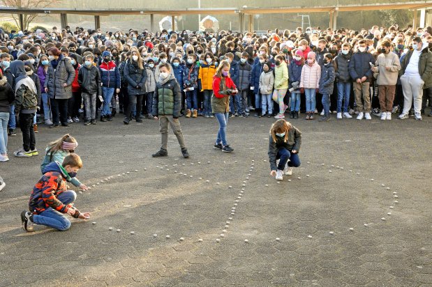 Das berühmte Friedenszeichen des britischen Künstlers Gerald Holtom leuchtete auf dem Schulhof des Heinrich-Heine-Gymnasiums. Die Schülerinnen und Schüler stellten es gemeinsam mit ihren Lehrerinnen und Lehrern Kerze um Kerze zusammen. Das Schülerorchester spielte John Lennons legendäres Lied „Imagine“, eine Hymne der Friedensbewegung, und viele sangen leise mit. Dann wurde es still auf dem Schulhof an der Gustav-Ohm-Straße. Mit einer Schweigeminute mahnten die jungen Leute, den Krieg in der Ukraine zu stoppen. Nur die Klänge einiger Glocken unterbrachen die Stille.