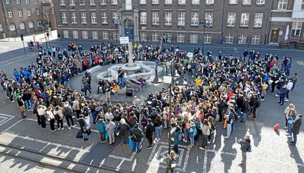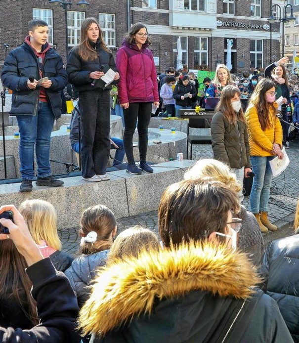 In der Schülermenge rund um den Rathausbrunnen sind derweil viele Plakate zu sehen, die Demokratie und Frieden fordern, blau-gelbe Poster, auch Friedenstauben und Regenbogenfarben. JAG-Abiturientin Liva hält wie Mitschülerinnen gelbe Nelken in der Hand. Die Solidaritätsaktion ist aus ihrer Sicht „definitiv etwas sehr Gutes. Dass ganz kleine und große Schüler mitmachen und dass auch die Kleinen merken, dass man sich so für etwas einsetzen kann.“
