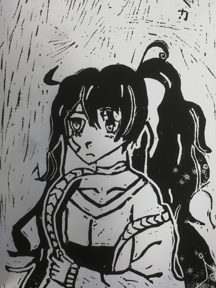 Die Schülerinnen und Schüler der Klasse 7d erstellten Porträts mit charakteristischen Merkmalen des Mangas. Die Zeichnung wurde in eine Linoldruckplatte eingeritzt, um anschließend einen Druck davon zu erstellen!