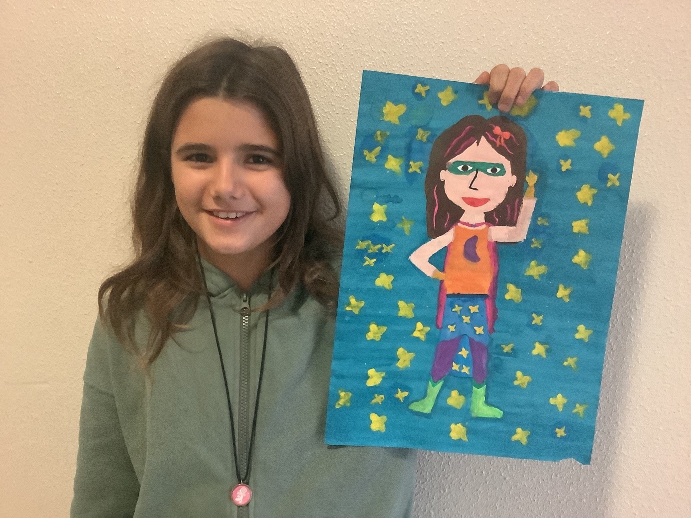 Und wie Milla Braun aus der Klasse 5d als Superheldin aussieht, wenn sie nicht gerade undercover die Schulbank drückt, hat sie eindrucksvoll zu Papier gebracht. Wir finden: Eine wohlverdiente Auszeichnung als Kunstwerk des Monats November ist hier nötig! Herzlichen Glückwunsch!!!