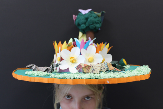 Die Schülerinnen und Schüler des Differenzierungskurses Kunst/Geschichte sowie der Jgst. 7 schlüpften demnach in die Rolle echter Designer. Ihre Hüte entstanden anfänglich im heimatlichen Atelier – daher wurde auf ein leicht zugängliches und in jedem Haushalt vorhandenes Material zurückgegriffen: Papier und Pappe in allen erdenklichen Varianten. Die Herausforderung bestand darin, das zweidimensionale Material durch Falten, Rollen, Knüllen in eine dreidimensionale Struktur zu verwandeln. Das Thema der Hüte war für die Designer frei wählbar.