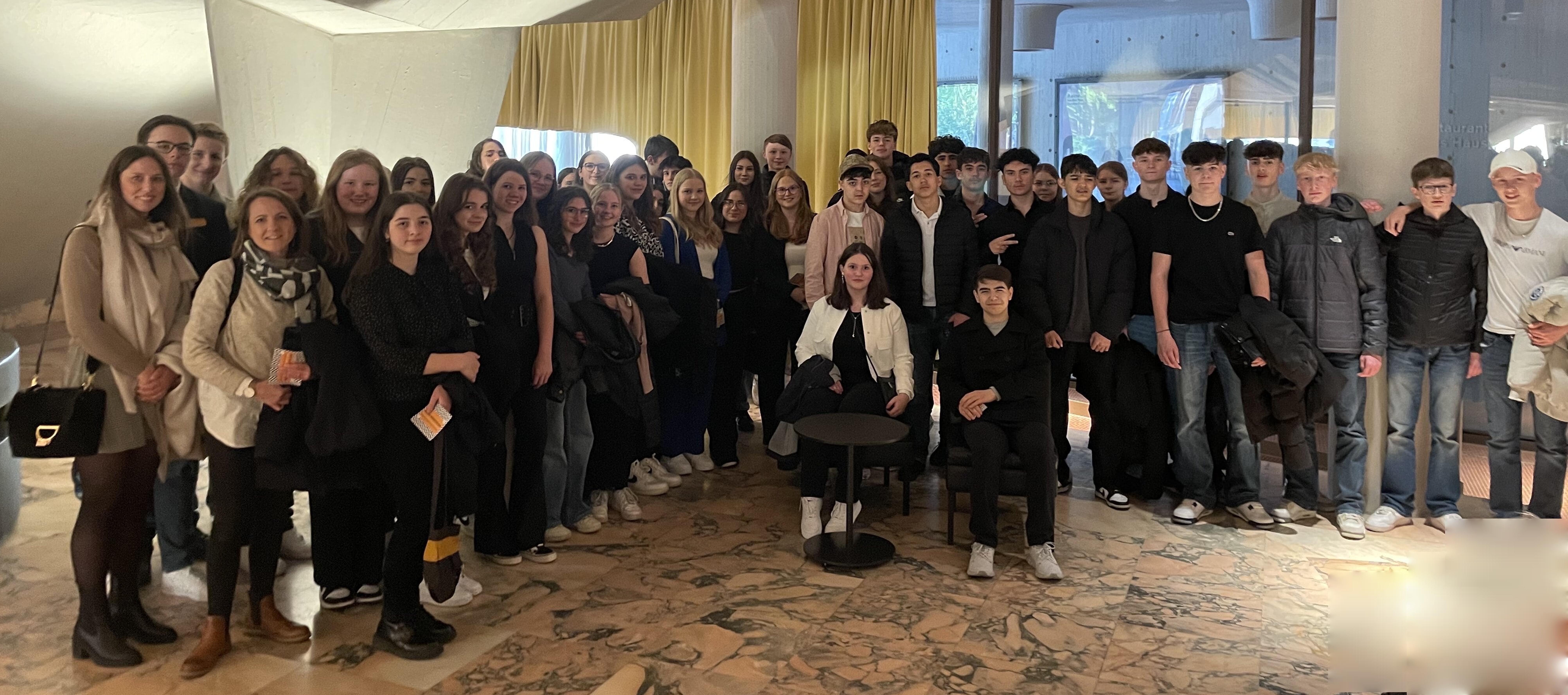 Im Rahmen der Unterrichtsreihe zu Dürrenmatts Drama "Der Besuch der alten Dame" haben die Schülerinnen und Schüler der Klassen 9a und 9d gemeinsam mit ihren Deutschlehrerinnen Frau Strelzik und Frau Morsbach am 23.04.2024 eine abendliche Aufführung im Schauspielhaus Düsseldorf besucht.