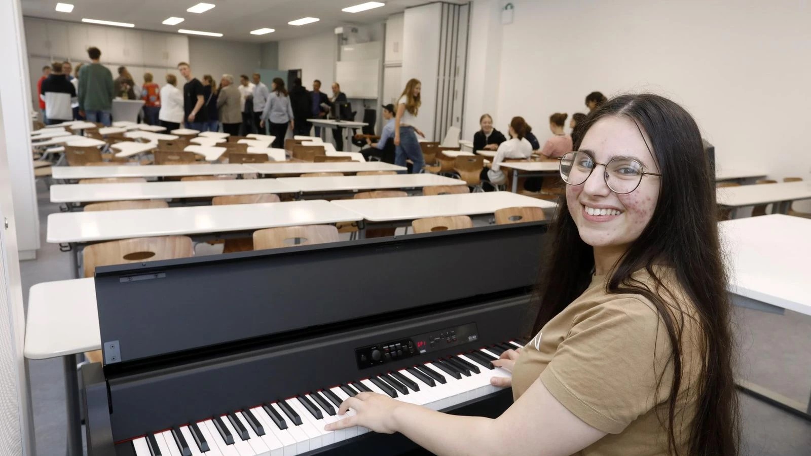 Vor sechs Jahren kam sie aus Aserbaidschan nach Deutschland. „Ich konnte kein Wort Deutsch, außer Hallo“, sagt sie in perfektem Deutsch und lächelt. Sie lernt in kürzester Zeit die Sprache. Und vor vier Jahren entdeckt sie die Musik und das Klavier für sich – sowohl privat als auch im Musikunterricht. „Der neue Musikraum ist wirklich optimal. Man hört die Töne sehr gut“, sagt sie.