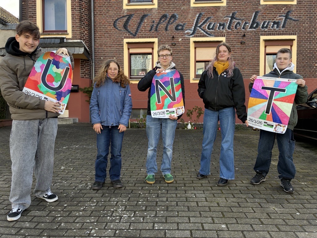 Dazu sind wir von unserer Schule aus gemeinsam zum Rathaus gelaufen. Auf dem Weg haben wir Fotos mit Plakaten, darauf Buchstaben, welche wir farbenfroh designt hatten, gemacht. Die Buchstaben bilden ein Teil der Botschaft „Bunt gegen Hass“. Die anderen Buchstaben wurden von den anderen Schulen gestaltet. Am Rathausplatz haben wir uns dann mit dem Referat für Migration und anderen Courage Schulen der Stadt Bottrop getroffen.
