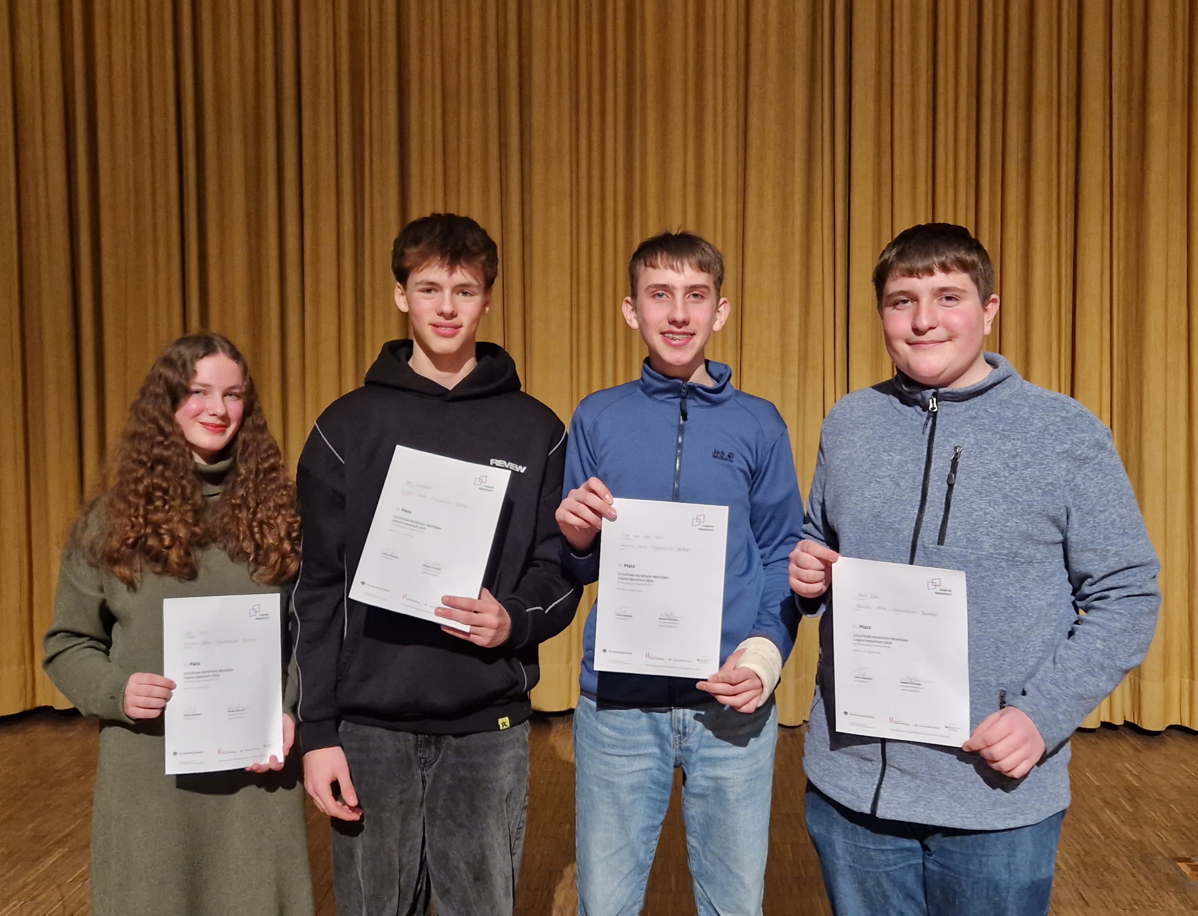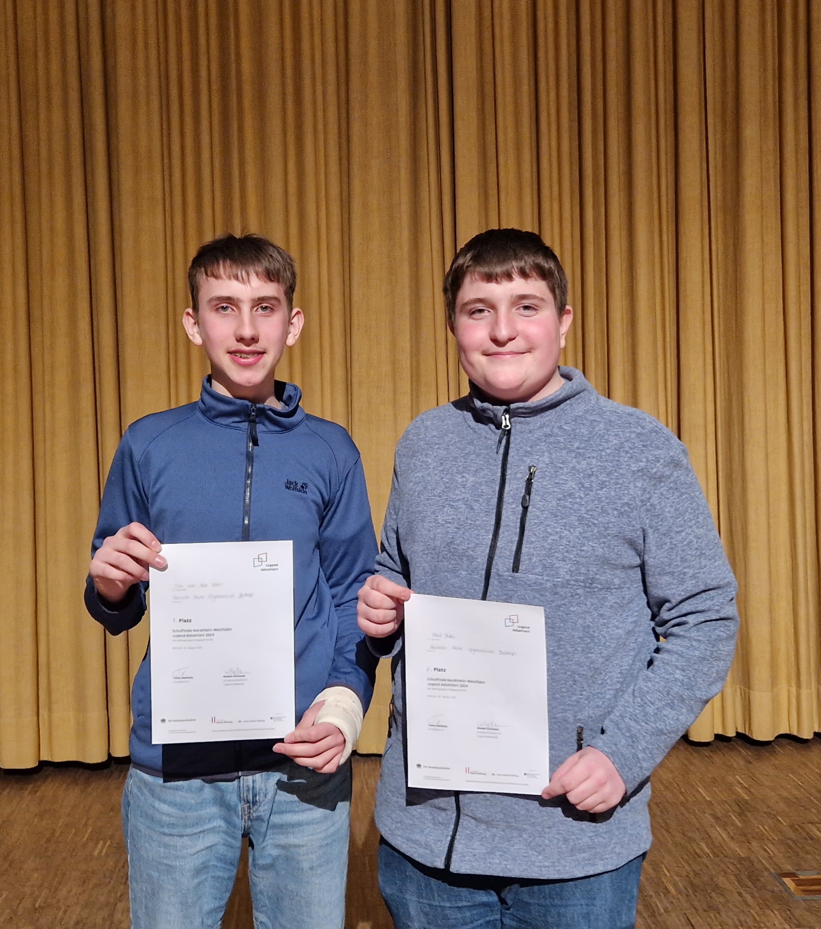 Im diesjährigen Schulwettbewerb von Jugend debattiert konnte sich Tim von der Haar aus der Klasse 9d gegen die anderen Teilnehmerinnen und Teilnehmer durchsetzen und den ersten Platz belegen. Zusammen mit Phill Mika aus der 9b, der den zweiten Platz belegte, wird er das Heinrich-Heine-Gymnasium am 08.02.2024 beim Regionalwettbewerb in Marl vertreten.