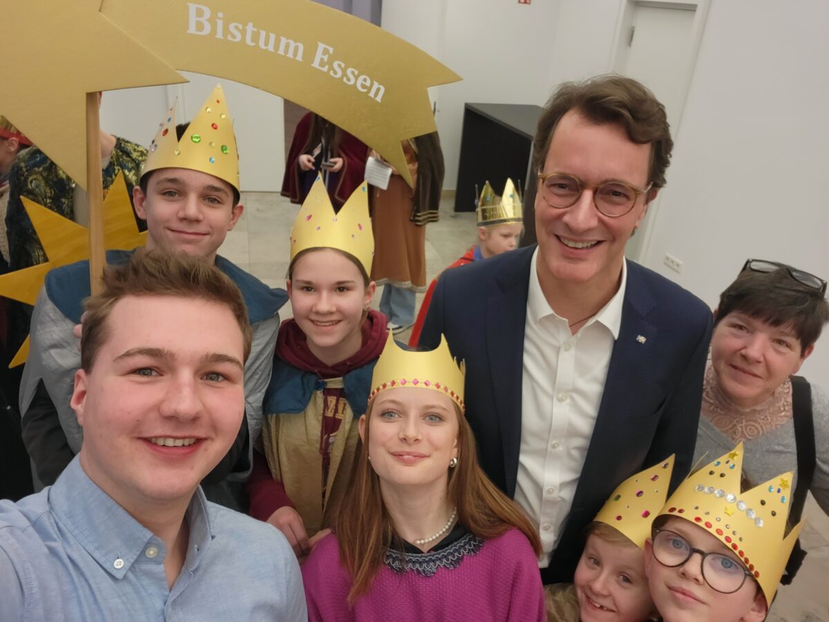 Nachdem die jungen Könige in Düsseldorf den Neujahrssegen zunächst zu Josefine Paul gebracht hatten, die das Ministerium für Kinder, Jugend, Familie, Gleichstellung, Flucht und Integration des Landes Nordrhein-Westfalen leitet, ging es weiter zur Staatskanzlei an den Rhein. Dort wurden sie von Ministerpräsident Hendrik Wüst empfangen, der sich über den Segen der Sternsinger freute und ihnen wie zuvor Josefine Paul auch eine Spende für Kinder