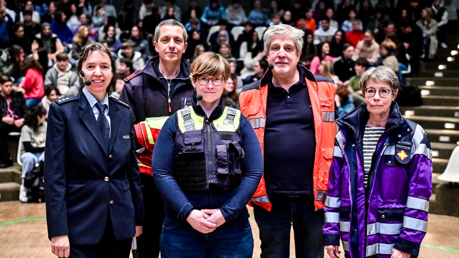 Im HHG haben sich zehn Klassen der zehnten und elften Jahrgangsstufe versammelt, vier davon aus der August-Everding-Realschule. Sie wurden mit erschreckenden Bildern, Videos und Erfahrungsberichten konfrontiert. Eine Schülerin musste den Raum sogar in Begleitung einer Seelsorgerin verlassen.