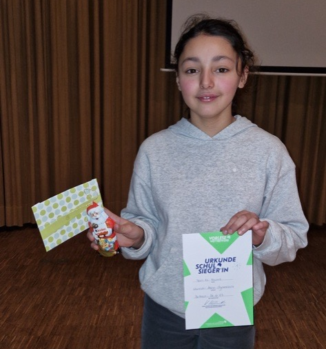 Nach 90 Minuten wurde Yara El Hamani aus der 6c zur Siegerin des Vorlesewettbewerbs gekürt. Mit J.K. Rowlings „Harry Potter und der Stein der Weisen“ wählte sie einen Klassiker der Kinder- und Jugendliteratur für die erste Runde des Wettbewerbs aus. Insbesondere in der zweiten Runde, in der alle Klassensiegerinnen und Klassensieger aus dem Kinderbuch „Der war’s“ von Juli Zeh und Elisa Hoven vorlesen mussten, konnte Yara sowohl Jury als auch Publikum überzeugen. Weiter geht es für die Siegerin im nächsten Jahr, wenn sie sich mit den anderen Bottroper Schulsiegerinnen und -siegern im Stadtentscheid messen muss und dabei das HHG würdig vertreten wird. WIR gratulieren Yara herzlich zu ihrem Sieg und wünschen ihr ganz viel Erfolg für den weiteren Wettbewerb.
