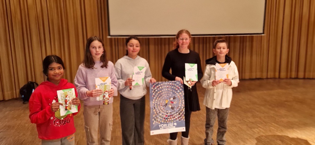 Rund 300 Schülerinnen und Schüler aus den Klassen 5 und 6 machten richtig Stimmung und feuerten die Vorlesenden in der Aula des Heinrich-Heine-Gymnasiums lautstark an. In den zwei Pausen, in denen sich die Jury (Vorjahressiegerin Leni Busch, unsere ehemalige Lehrerin Frau Gabel sowie die Lehrkräfte L. Fischer und D. Nyenhuis) zur Beratung zurückzog, verteilten Schülerinnen der SV einen schokoladigen Gruß und Lehrerin Alice Vervoorts sorgte mit weihnachtlichen Musikstücken zum Mitsingen für gute Laune.