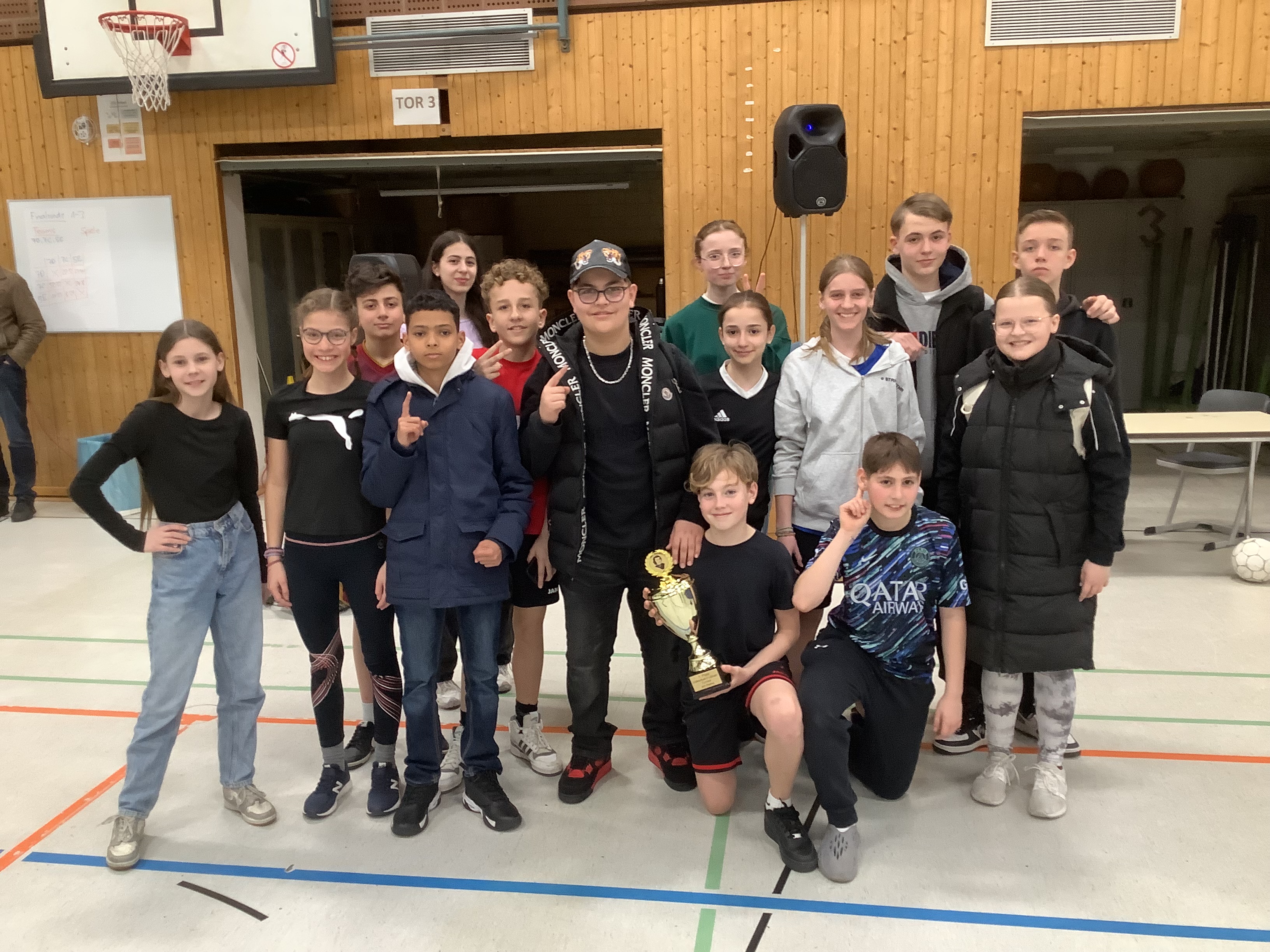 Die Vorfreude auf das Turnier war erneut überwältigend. Nach der 6. Stunde füllten sich die Parkplätze vor der Turnhalle rasch mit Schülerinnen und Schülern der Jahrgangsstufe 5,6 und 7. Die Kinder drängten in die Halle, um sich schnell umzuziehen, sich aufzuwärmen, die Auslosung zu verfolgen und herauszufinden, wann die Klasse in welcher Disziplin an der Reihe war.