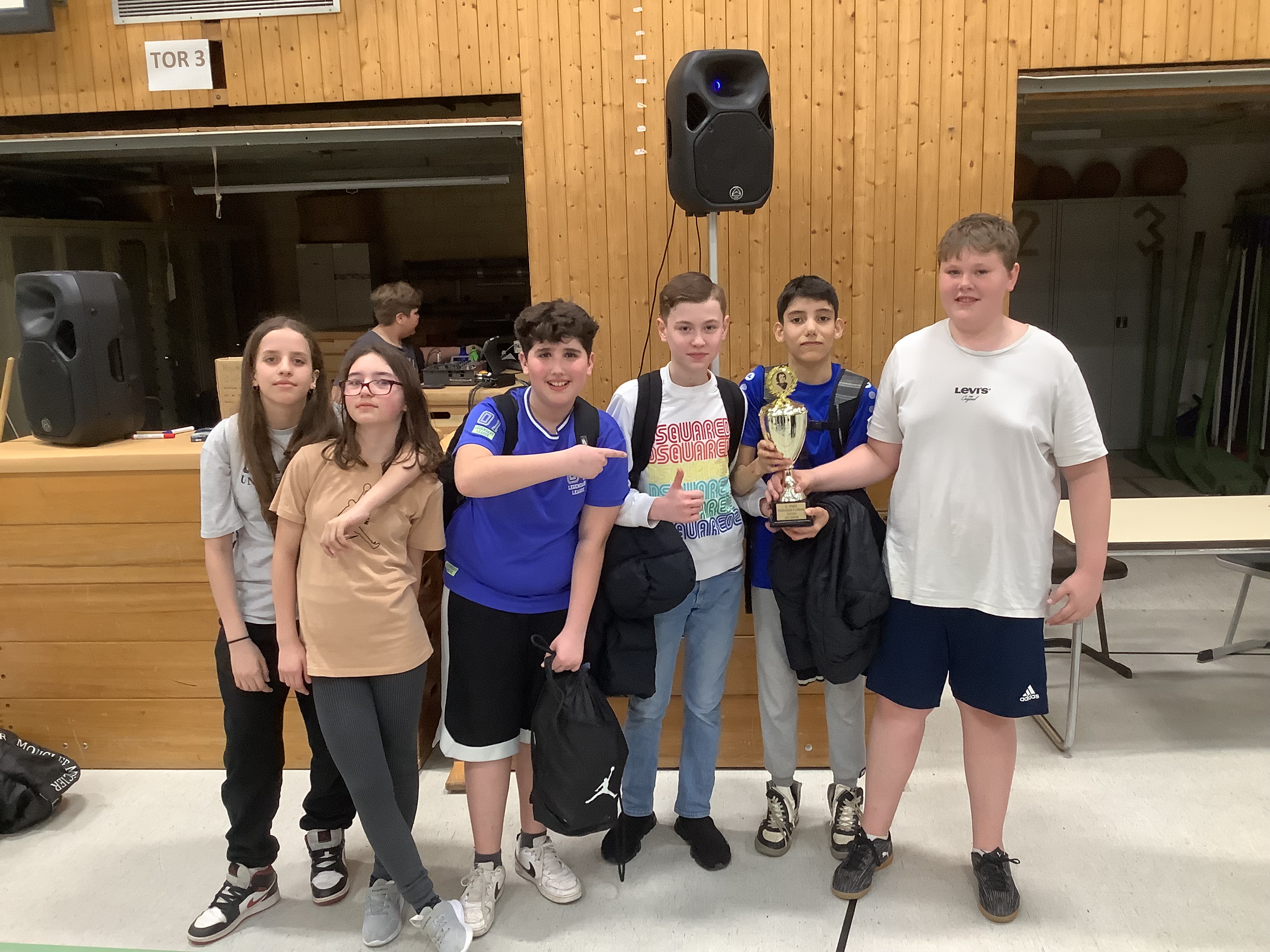 Es war geregelt, dass bei Spielen zwischen Schülerinnen und Schülern der 7. Jahrgangsstufe die niedrigeren Jahrgangsstufen in der Überzahl waren. Zwischen den einzelnen Spielen wurde den Teilnehmenden ausreichend Zeit eingeräumt, um sich zu erholen oder ihren Klassenkameraden zuzusehen. Viele der Anwesenden unterstützten ihre Klassenmannschaften, indem sie auf den dafür vorgesehenen Sitzgelegenheiten Platz nahmen und diese mit enthusiastischem Beifall anfeuerten. Leandro unser DJ trug ebenfalls dazu bei, eine angenehme und motivierende Atmosphäre während des Turniers zu schaffen. Zwei Schüler*innen sorgten auch für Verpflegung während des Turniers.