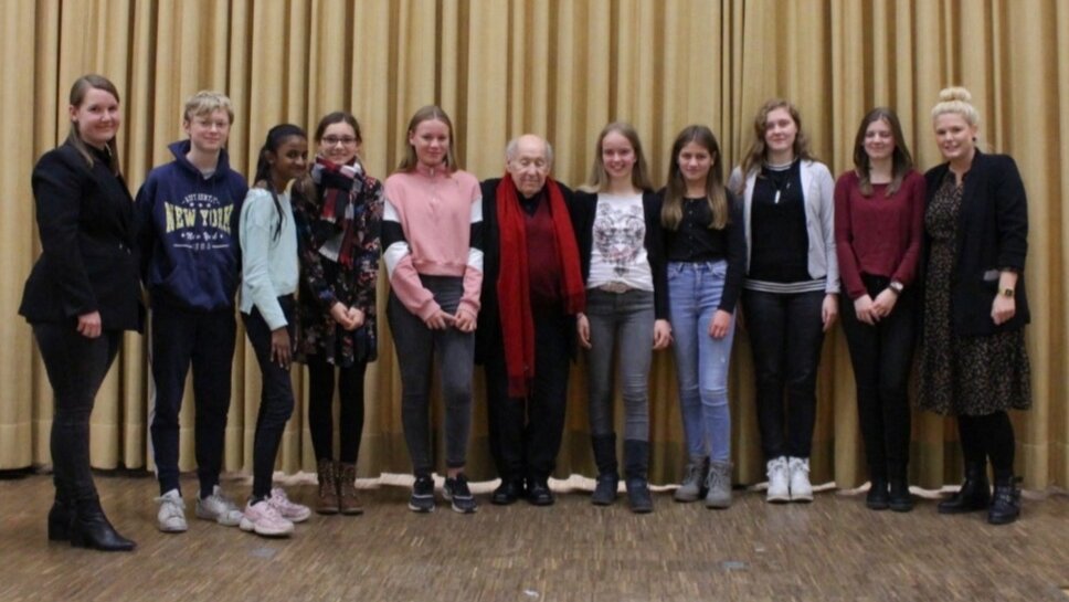 Im Anschluss daran machten sich die Initiativgruppe auf die Suche nach einem geeigneten Schulpaten, der ebenfalls von dem Projekt vorgesehen ist. Eine Suche die sich als recht langwierig erwies. Lange Zeit war sich die Gruppe unsicher, wer überhaupt für eine Patenschaft in Frage kommen könnte und im Interesser aller die Schule nach außen vertritt. Als das HHG aber dann am 09.12.2019 den Zeitzeugen Sally Perel für eine Lesung und anschließende Fragerunde in der eigenen Aula begrüßen durfte und er von allen Anwesenden, zu tiefst berührt von seiner emotionalen Geschichte und seinem enormen Mut, sich seiner Vergangenheit zu stellen, mit Standing Ovations empfangen und auch wieder verabschiedet wurde und sich eine riesige Traube mit Autogrammjägern um ihn gebildet hatte, hatten die Schüler*innen ihren Paten gefunden und alle Zweifel waren verflogen. Sie fassten ihren Mut zusammen und sprachen Herrn Perel nach der Veranstaltung bezüglich der Patenschaft an. Herr Perel zeigte sich sichtlich gerührt und antwortete, dass es ihm eine große Ehre sei der Schulpate des Heinrich-Heine-Gymnasiums zu werden (siehe Foto).