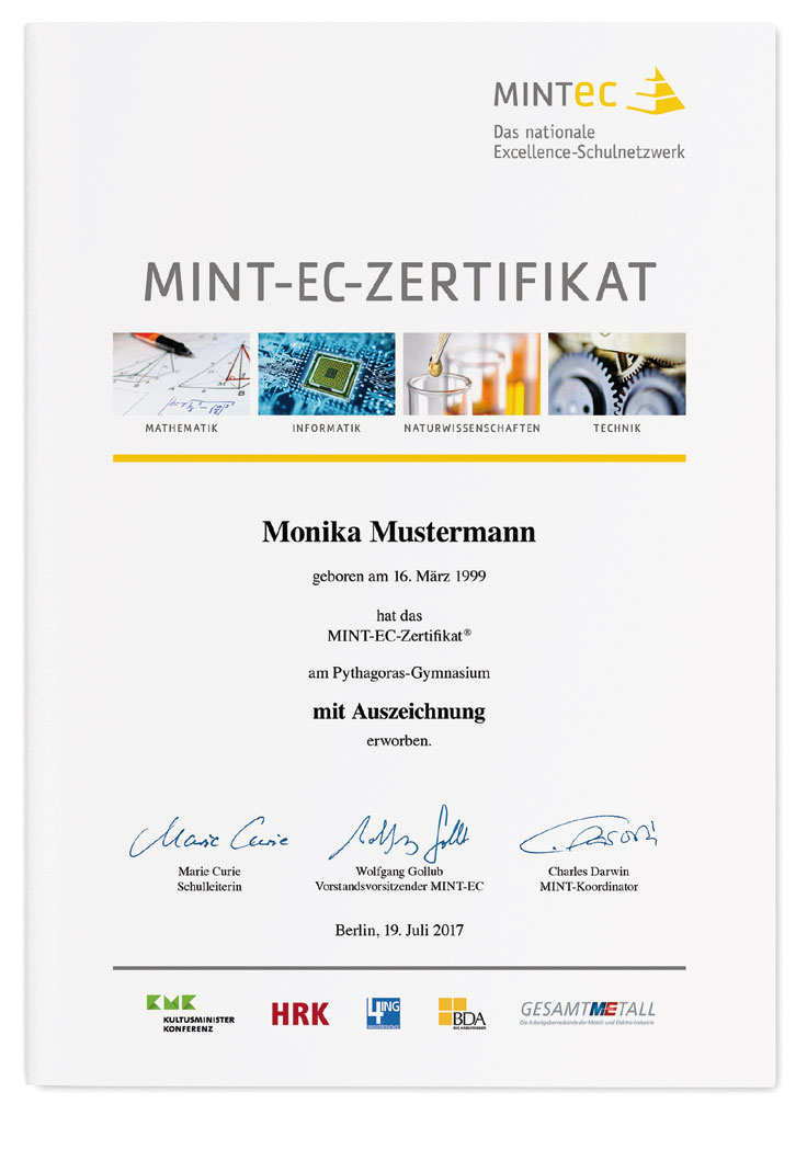 Durch die Aufnahme als Anwärterschule in den Kreis der MINT-EC-Schulen wird seit dem Schuljahr 2018/2019 das deutschlandweit gültige MINT-EC-Zertifikat an Schülerinnen und Schüler, die sich über ihre gesamte Schullaufbahn hinweg über den Unterricht hinaus im MINT-Bereich engagiert haben, mit dem Abiturzeugnis verliehen.