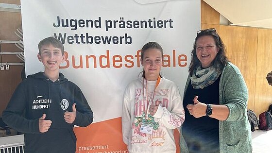 Marlene Barb und Tim von der Haar (beide Klasse 8d) haben am Bundesfinale Jugend präsentiert mit ihrem Vortrag zum Thema „Klimastress“ am letzten Wochenende, 16.09. – 18.09.2022, in Berlin teilgenommen.